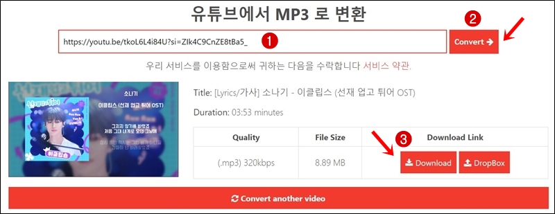 유튜브 음원추출 사이트로 돌아와서 검색창에 붙여 넣기를 해주고 Convet를 클릭한 후 다운로드 버튼을 눌러줍니다.
