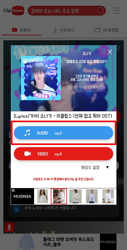 저는 요즘 핫하다는 이클립스 소나기를 검색했고, 여러 개 뜨는 동영상 중 하나를 선택하고 들어가면 위의 좌측 이미지처럼 다운로드 버튼을 볼 수 있습니다. 유튜브 음원추출 mp3로 넣고 싶다면 다운로드를 누른 후 AUDIO mp3 파일을 클릭하고 진행합니다. (URL 주소로 검색 시에는 별도의 다운로드 버튼 없이 자동으로 다운됨)