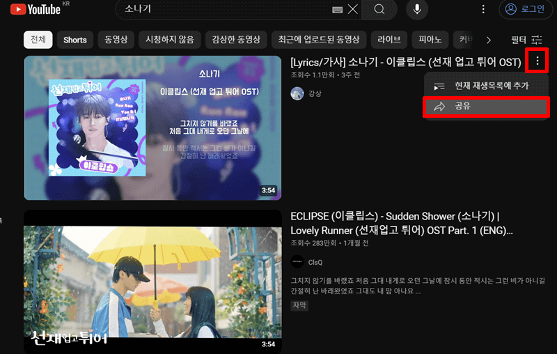 먼저 유튜브에 들어가서 음원추출할 영상의 주소를 복사해와야 하는데요~ 검색창에 키워드를 입력하면 뜨는 목록들 중 하나를 골라 제목 옆에 있는 점 세 개를 클릭한 뒤 공유 버튼을 눌러줍니다.