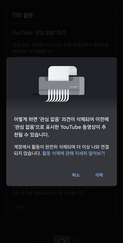 밑으로 쭉 내리다보면 제어 영역의 기타 활동이 뜨는데 기타 활동 상단에 있는 YouTube 관심 없음 의견에 있는 삭제 버튼을 클릭면 관심 없음으로 표시한 유튜브 동영상이 다시 추천 영상에 뜨게 됩니다.