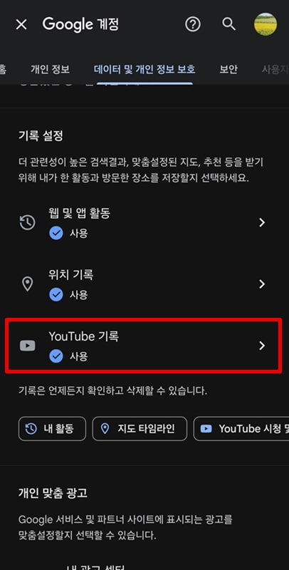 이후 유튜브 기록을 찾아서 클릭하고 기록관리를 한번 더 클릭합니다.