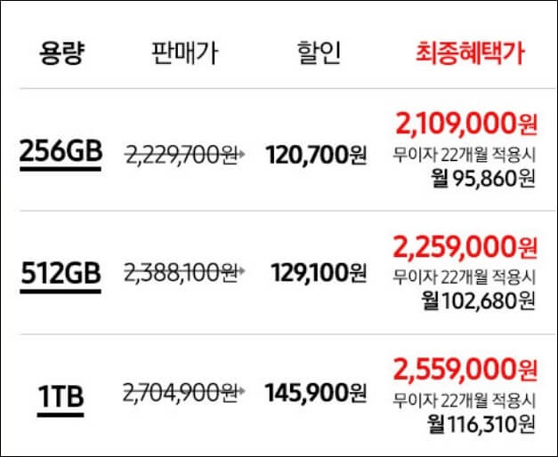 256GB로 구매할경우에는 120,700원을 할인받아 2,109,000원에 구매할수 있고, 512GB로 구매할 경우에는 129,100원을 할인받아 2,259,000원에 구매할 수 있으며 1TB로 구매할 경우에는 145,900원을 할인받아 2,559,000원에 구매할수 있습니다.