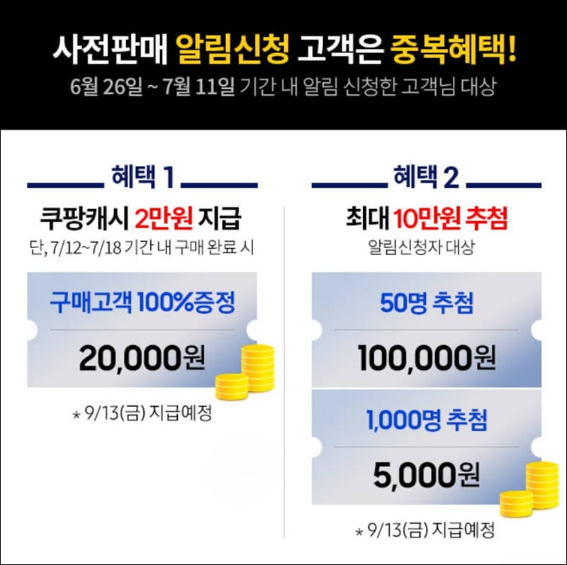 6월 26일부터 7월 11일까지 기간 내에 갤럭시 z6플립과 z폴드 사전예약 알림 신청을 하셨던 분들은 쿠팡캐시 2만 원을 받을 수 있고, 50명 또는 1,000명을 추가로 추첨하여 쿠팡캐시 10만 원과 5천 원을 중복 지급합니다.