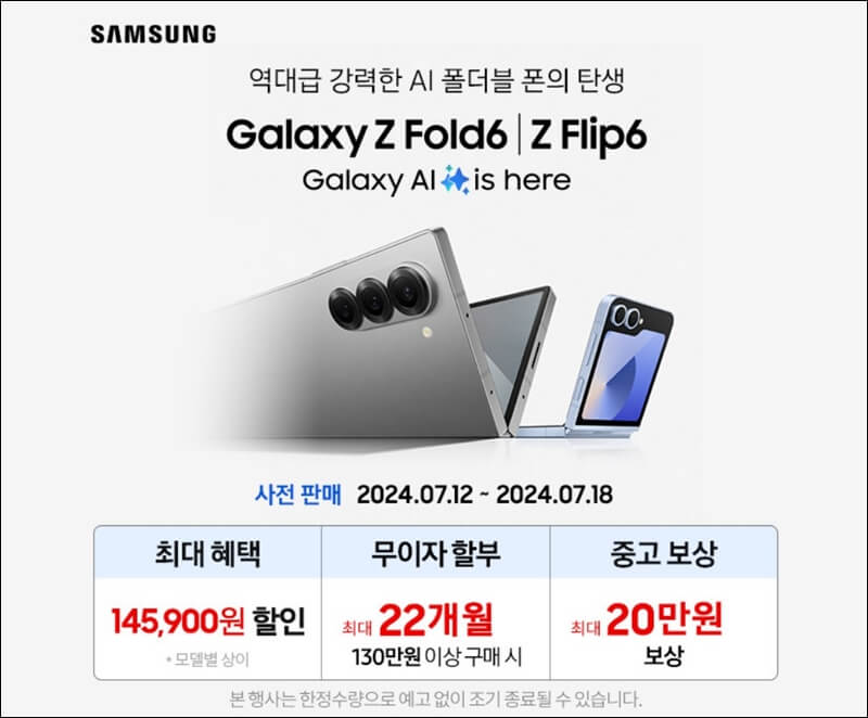 2024 갤럭시 언팩 행사가 끝나고 12일인 오늘부터 갤럭시 z플립6와 z폴드6의 사전예약 판매가 시작되었는데요~ 18일까지만 진행되는 갤럭시 z플립6, z폴드6 사전예약 사은품 혜택은 무엇이 있는지 알아보도록 하겠습니다.