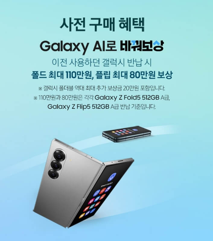 여기에 삼성닷컴도 쿠팡에서와 마찬가지로 바꿔보상을 통해 최대 110만 원을 보상받을 수 있으니 그동안 z5시리즈를 사용하면서 z6시리즈로 바꾸고 싶으셨던 분들은 갤럭시 z플립6, 갤럭시 z폴드6 사전예약할 때 바꿔 보상 혜택을 통해서 최대 혜택을 받으시기 바랍니다.
