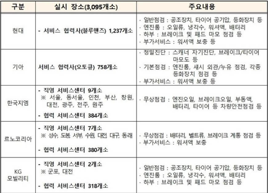 하지만 이번 휴가철 차량 무상점검 서비스는 현대차와 기아차 뿐만 아니라 한국지엠, 르노코리아, KG 모빌리티도 진행한다고 하는데요~ 한국지엠 같은 경우에는 지역서비스센터 9개소와 협력서비스 센터 380개소에서 무상점검 서비스를 진행하고, KG 모빌리티는 직영 서비스센터 2개소와 318개소의 협력 서비스센터에서 무상점검 서비스를 24일(수) ~ 26일(금)까지 진행한다고 합니다.