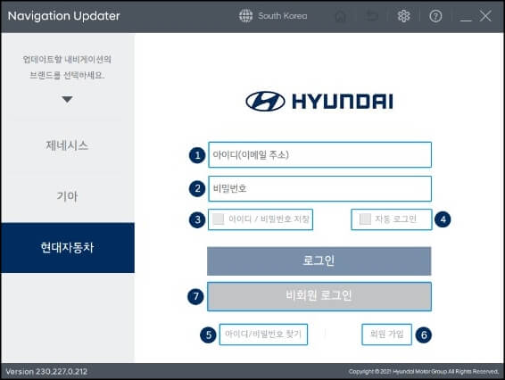 5. 설치가 완료되면 바탕화면에 내비게이션 업데이트 아이콘이 생성되어 있을 텐데요~ 이 아이콘을 실행하면 로그인하라는 창이 뜨는데 현대자동차 홈페이지에 가입된 계정의 아이디를 입력하고, 비회원 로그인도 가능하지만 앞으로도 계속해서 이를 이용할 계획이라면 회원가입을 해놓는 것도 좋습니다.