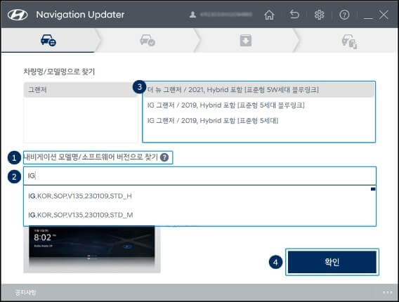 6. 로그인을 했다면 이제 내 차량의 내비게이션 모델번호 또는 소프트웨어 버전을 입력하거나 수동으로 선택을 해야 하는데요~ 내 차량의 모델명과 소프트웨어 버전 정보는 차에 있는 내비게이션 환경설정에서 시스템정보 > SW정보 또는 설정 > 일반 > SW정보/업데이트에서 확인할 수 있습니다.
