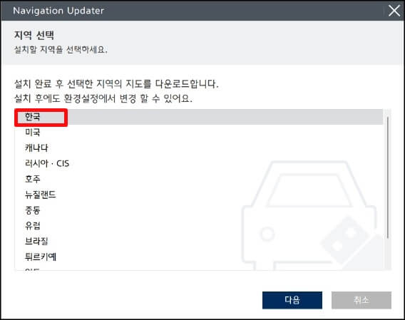 1. 저희 집 컴퓨터는 윈도우를 사용하고있기 때문에 윈도우 버전으로 설명드리겠습니다. 위의 내비게이션 업데이트 파일 설치를 통해 프로그램을 컴퓨터에 설치했다면 프로그램에서 사용할 지역을 선택한 후 다음 버튼을 클릭합니다.