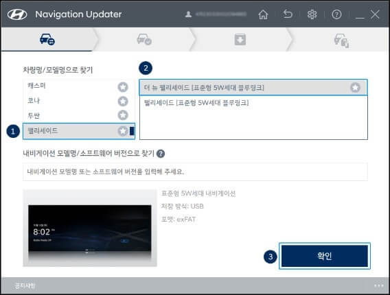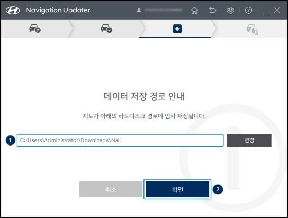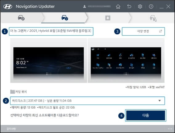 7. 본인의 차량 모델을 찾았다면 선택한 차량이 맞는지 한번 더 확인하고 업데이트 데이터를 저장할 위치를 선택한 뒤 다음 버튼을 클릭합니다. (만약 차량을 변경하고 싶다면 오른쪽 상단에 있는 차량 변경 버튼을 클릭하고 변경하면 됩니다.)