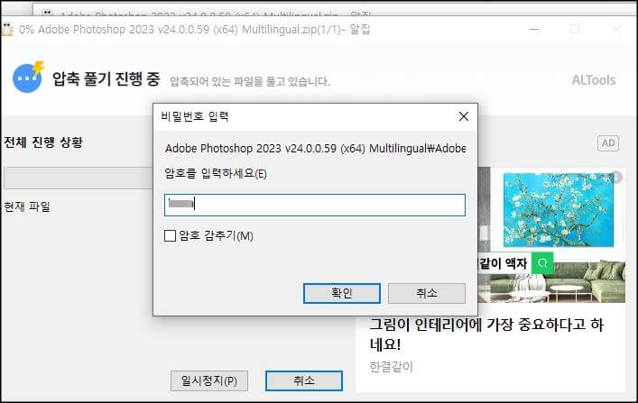 3. 컴퓨터에 다운로드 된 파일을 실행하면 압축 풀기가 진행되기 전 비밀번호를 입력하라는 창이 뜰 텐데요~ 비밀번호는 123니까 입력창에 123을 입력하고 확인 버튼을 누르면 압축 풀기가 진행됩니다.