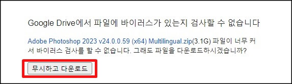 2. 파일 용량이 커서 바이러스가 있는지 검사할수 없다는 팝업창이 뜨면 무시하고 다운로드 버튼을 눌러줍니다.