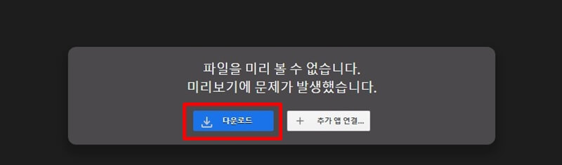 1. 위와 같이 파일을 미리볼수 없으며 미리 보기에 문제가 발생했다는 팝업이 한가운데 떠있을 텐데요~ 여기서 파란색의 다운로드 버튼을 누르고,