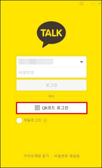 컴퓨터 바탕화면에 설치를 완료했다면 이제 핸드폰에서 사용하고 있는 카톡과 연동을 해줘야 하는데요~ 핸드폰에서 사용하고있는 아이디와 비밀번호로 로그인을 하면 자동으로 연동이 되고, 만약 외부에서 사용하는 일이 생긴다면 로그아웃이 되지 않을 때가 있을 수도 있기에 qr코드 로그인을 선택하여 1회용으로 사용하는 것이 조금 더 안전합니다.
