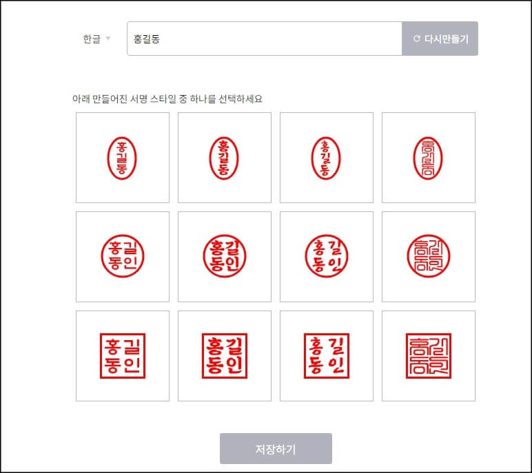 4. 그럼 위의 이미지처럼 여러 스타일이 무료 인터넷 도장을 만들어주는데요~ 여기서 내가 마음에 드는 도장을 선택하여 저장하기를 누르고, 만든 서명 내 메일로 보내기를 한번 더 클릭합니다.