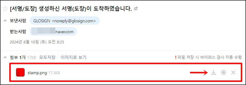 6. 이제 메일로 가서 전송받은 인터넷 도장 및 사인을 다운로드합니다. 핸드폰에서 해당 파일을 다운로드하면 내 파일 또는 갤러리에 저장되니 참고하시기 바랍니다.
