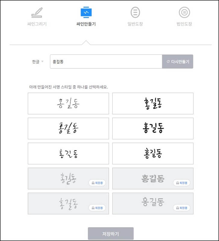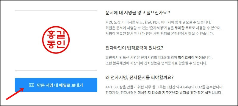 이번에는 싸인 만들기를 진행해 봤습니다. 직접 싸인 그리기에서 싸인을 그려도 되지만 저는 그냥 편리하게 기본적으로 제공해 주는 만들기로 만들어봤고, 무료로 사용할 수 있는 스타일 중 하나를 선택하여 인터넷 도장과 마찬가지로 저장하기를 누르고 메일로 전송받습니다.