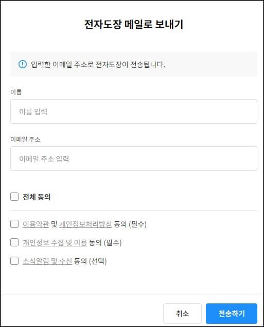 5. 본인의 이름과 이메일 주소를 입력한 뒤 개인정보 수집 및 이용 동의와 개인정보처리방침 및 이용약관 동의에 체크를 해주고 전송하기를 클릭합니다.