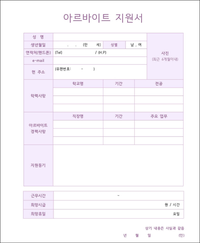 그리고 요즘에는 아르바이트를 하려고해도 이력서를 작성해야 하는 곳들이 많은데요~ 그럴 때는 기본적인 이력서 양식보다는 위와 같은 아르바이트 이력서 양식을 사용하면 좀 더 편리하게 작성할 수 있습니다.